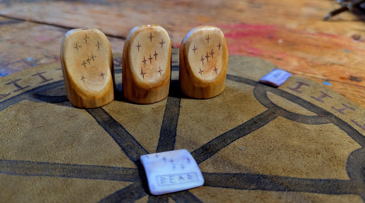 🪓 Craft: This Roman Bear Game set was experimental in many ways. I painted the board on the suede side of leather using walnut ink and elderberry ink from Erica Spitzer-Rasmussen’s inkmaking class, a technique I had never tried before. It worked great. Some of the game pieces are bone, which I attempted to scrimshaw, also a new experience for me. The three standing pieces are kolrosed Maple, which were of course inspired by the kolrosing of Liesl Chatman. In kolrosing, too, I am a beginner.
