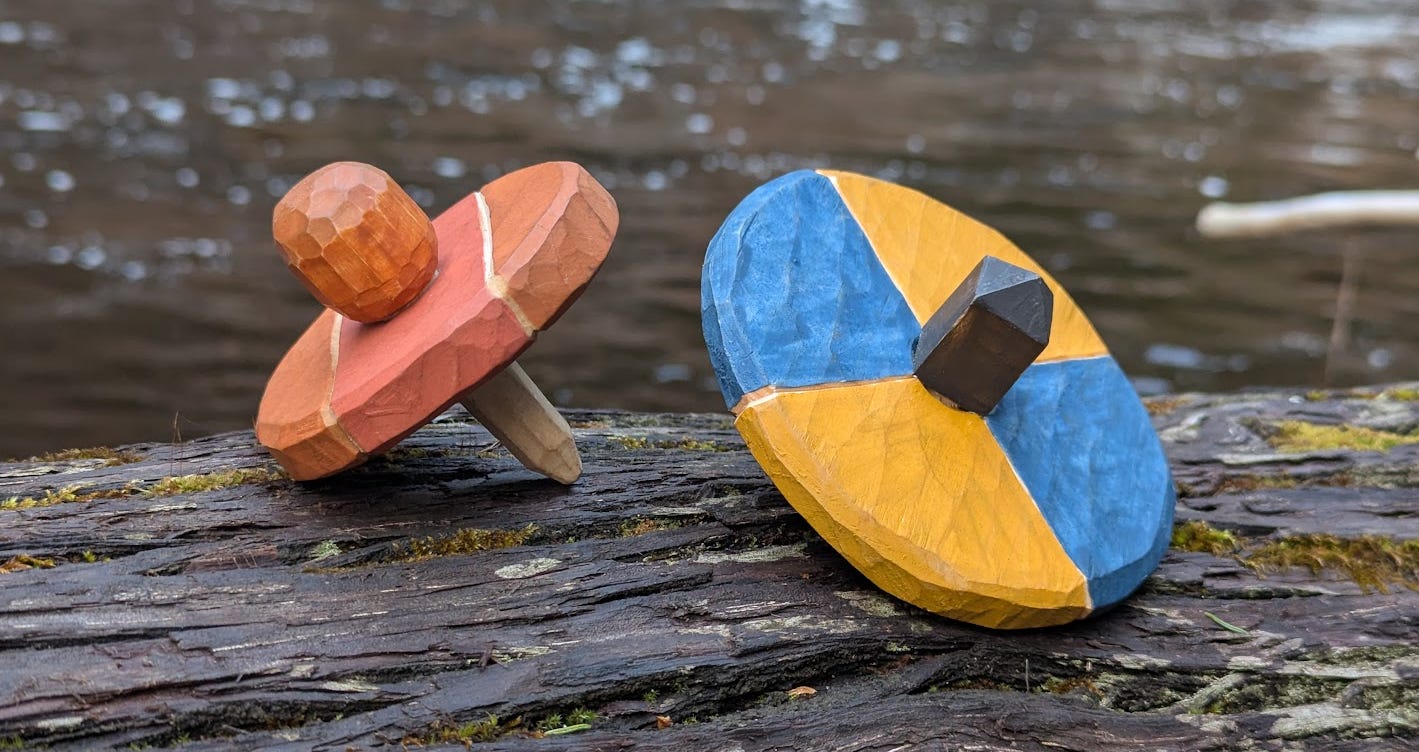 🪓 Craft: Tops! Traditionally tops are made on a lathe, but I am usually more drawn to crafts that can be done with hand tools, good background music, and no electric bill, rather than the whirring of expensive motors. The top on the left is made of Birch, the top on the right is Pine, and both are brightly colored with milk paint.
