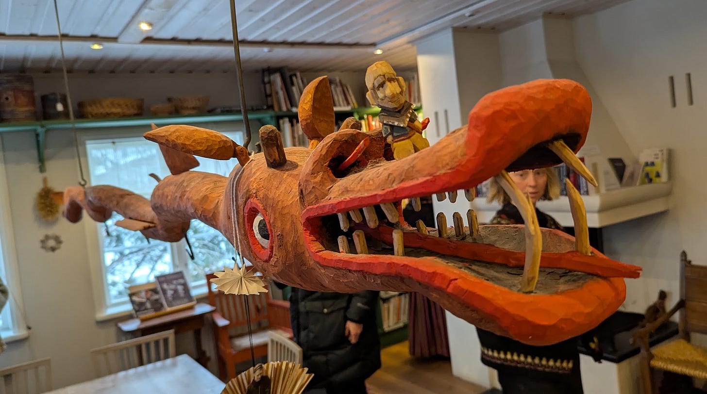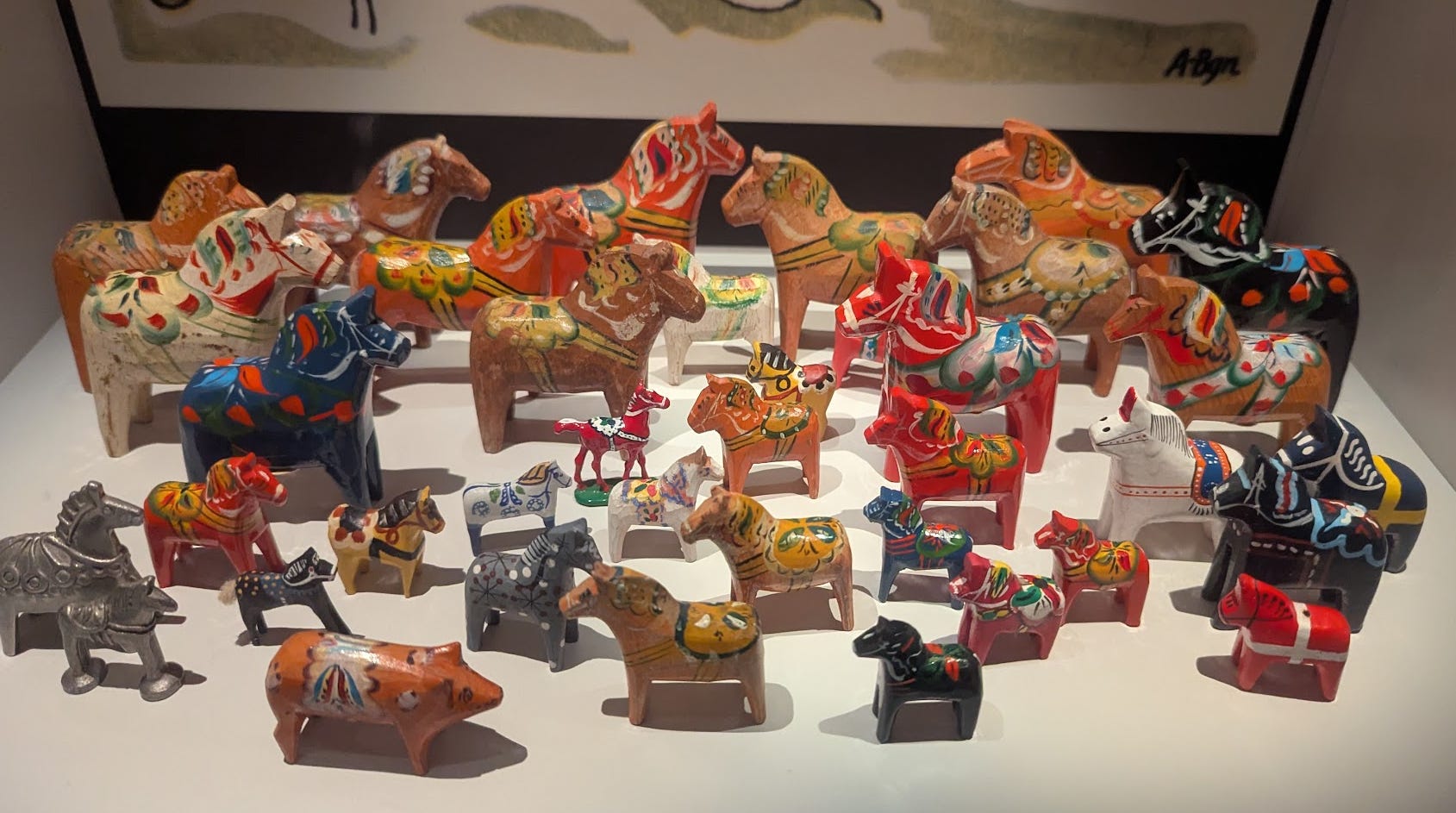 The Dala Horse, for example, was an economic invention for rural people to support themselves with an accessible craft. Anyone can learn to carve and paint a Dala Horse, and the country leaned into the horse as a symbol, and there you have it: a sustainable side hustle for anyone with a knife and a paintbrush, supported by craft consultants, encouraged by the public use of the Dala Horse as a semiotic lure for attracting tourists.